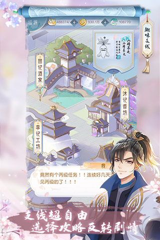 核心亮点在于其高规格叙事与互动。大量动态CG穿插于关键剧情节点,结合全语音覆盖的主线及角色个人剧情(风絮令),使角色情感表达生动立体。创新性的水镜系统详细记录与每位男主的好感事件及进度(开放至60级),并设有专属感情副本。游戏提供高自由度支线,玩家的行为不仅影响男主关系,更会衍生江湖八卦,甚至改变NPC的命运轨迹,让每个选择都充满意义。