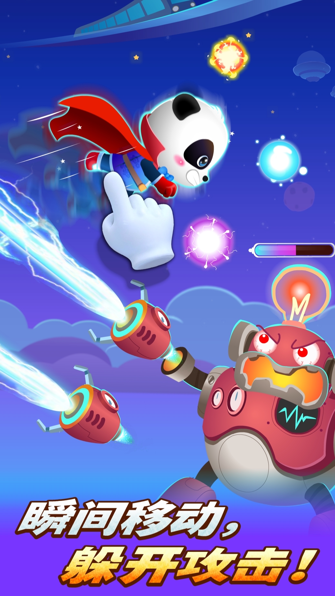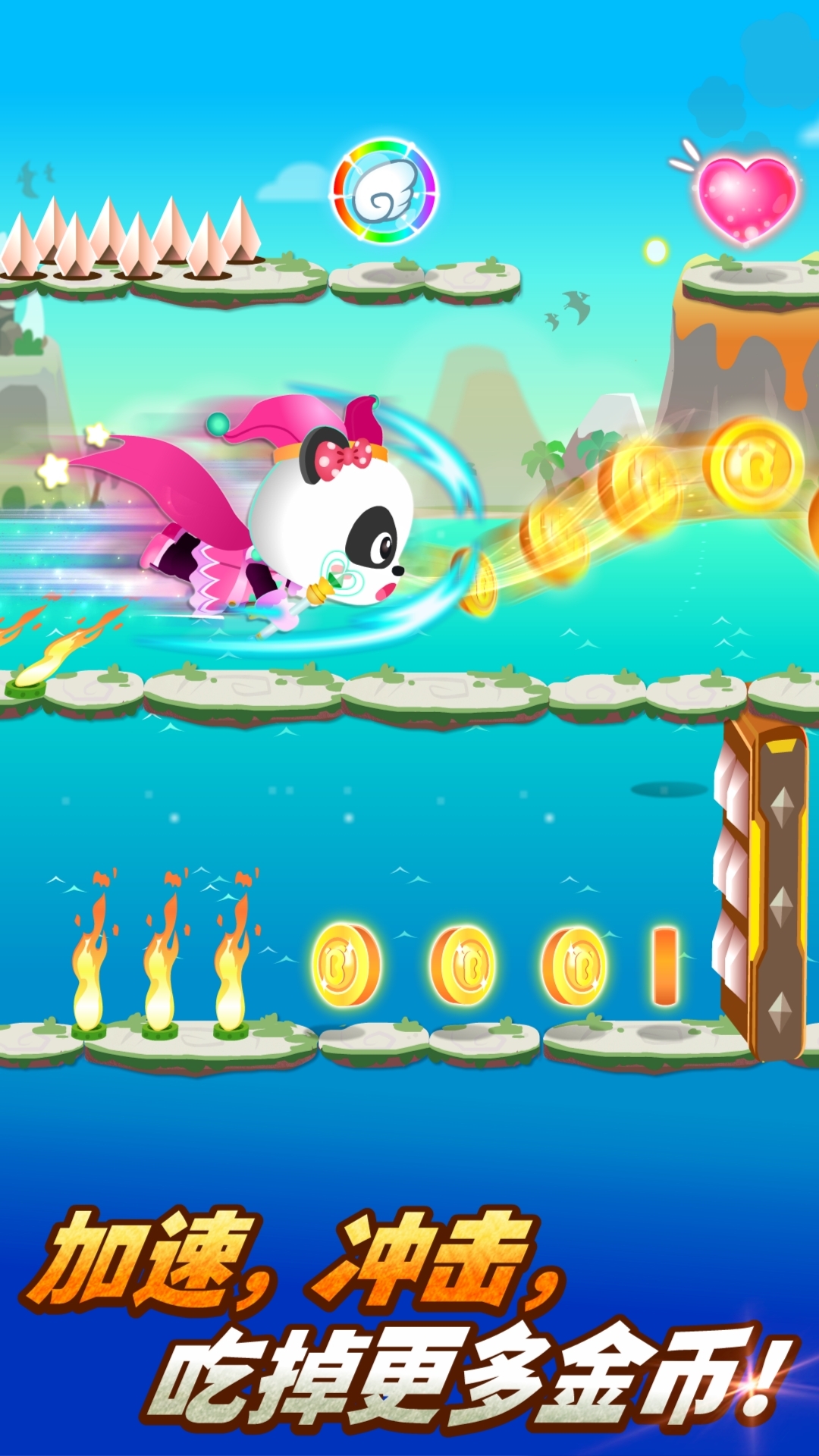 在这个充满惊喜的童话世界里,小伙伴们将开启一段段精彩纷呈的冒险旅程。每次旅程都从选择英雄队长开始,可能是勇敢的熊猫男孩,也可能是机智的熊猫女孩,每位小伙伴都能找到自己心仪的角色。通过简单的滑动操作,小英雄们需要在跑酷道路上灵活地跳跃、闪躲,避开熊熊燃烧的火焰和突如其来的电击,越过重重障碍。沿途收集爱心可以满血复活,获取金币则能解锁新装备,提升小英雄的生命值。当面对隐藏在暗处的大魔王时,需要擦亮眼睛获取能量,解除魔王的隐身魔法,每个关卡的大魔王都有着不同的技能特点,需要仔细观察才能取得最终胜利。