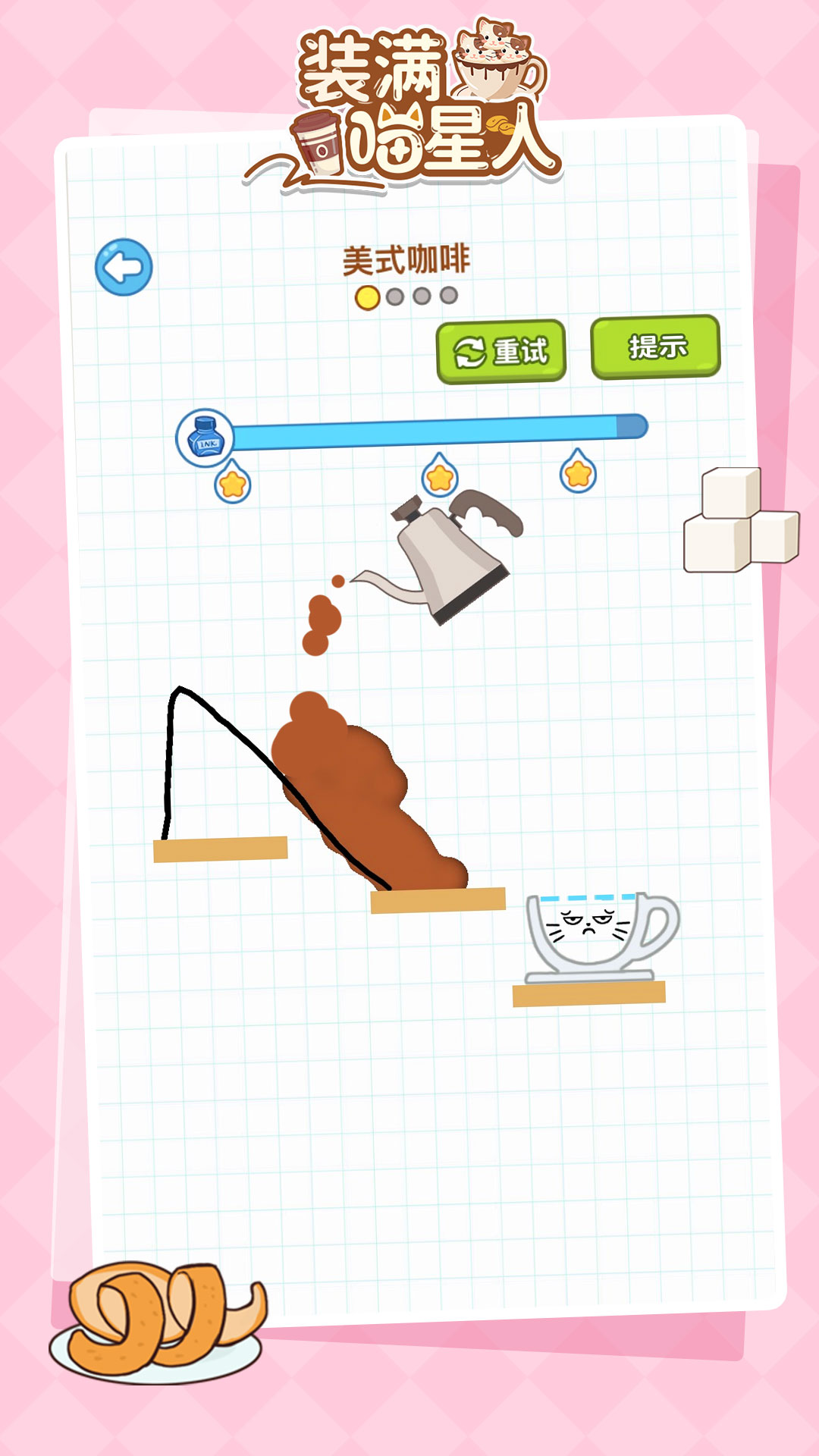 装满喵星人的显著亮点是其纯净无干扰的游戏体验与全年龄适配性。游戏采用全程无广告的运营模式,确保玩家沉浸于解谜乐趣不受打断。操作门槛极低,仅需简单画线即可上手,无论儿童或成年用户都能快速掌握并享受其中。画面采用清新简约的卡通风格,色彩明亮,喵星人形象与咖啡元素设计可爱治愈,视觉观感舒适。关卡难度曲线平缓上升,兼顾了休闲放松与适度挑战的平衡。