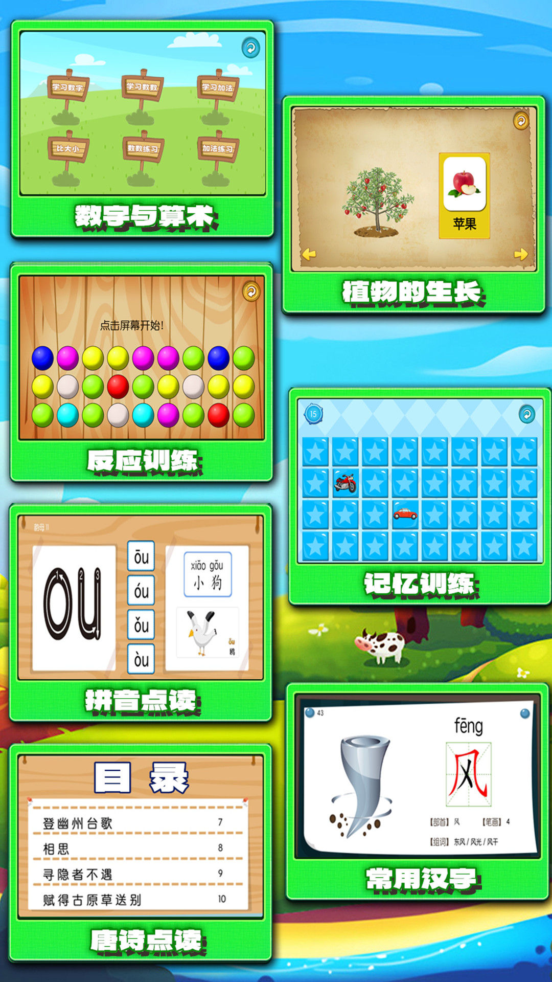 欢迎宝贝们来到这个色彩缤纷的虚拟乐园!这里划分了多个主题区域,每个区域都藏着不同类型的脑力挑战。小探险家们可以畅玩上百种精心设计的小游戏,比如考验眼力的找不同、锻炼空间感的迷宫、挑战记忆的翻牌配对、培养逻辑的数独,还有有趣的数字排列和图形拼图等等。游戏操作非常简单,界面清爽可爱,小朋友自己就能轻松上手。无论是几分钟的零散时间,还是想专注玩一会儿,这里总有适合宝贝的挑战内容。游戏还贴心地融入了拼音点读、汉字书写练习和诗词欣赏,让小宝贝在游戏中不知不觉认识汉字、数字和基础常识。