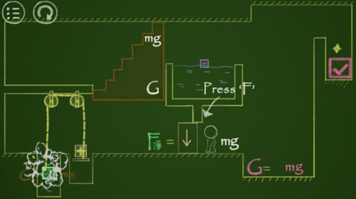 玩家需要操控一个小粉笔人或人气角色(如盒娘),目标是通过触碰关卡中的粉色对号方块来过关。场景中包含多种颜色编码的物理公式(例如G=mg代表重力),玩家可以实时修改这些公式的参数,如调整重力方向让角色在天花板上行走,或改变摩擦系数μ来推动重物。每个公式只对同颜色的物体生效,这要求玩家灵活组合不同规则(如动量或浮力)来解谜。游戏包含120多个官方关卡,类型从基础的堆叠方块到复杂的机关布置,难度逐步提升。玩家还能通过创意工坊自定义关卡,上传并挑战全球用户的脑洞设计,这大大扩展了游戏的可玩性。关卡中加入了提示系统,帮助玩家在卡关时获得灵感,但保留自主探索的乐趣。