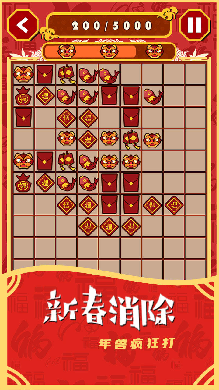 一起来年兽是一款休闲消除手游,巧妙结合了中国传统年兽文化与现代游戏玩法,带你沉浸在红红火火的春节氛围中。游戏中,你只需轻松滑动屏幕,就能将相同图案的方块连在一起消除,赶走年兽迎接新春。整个画面以喜庆的红色为主色调,点缀着红包、鞭炮和灯笼等节日元素,搭配轻快的音效,让你仿佛置身于热闹的过年场景。无论是操作简单易上手,还是浓浓的年味设计,都让这款游戏成为老少皆宜的欢乐选择。