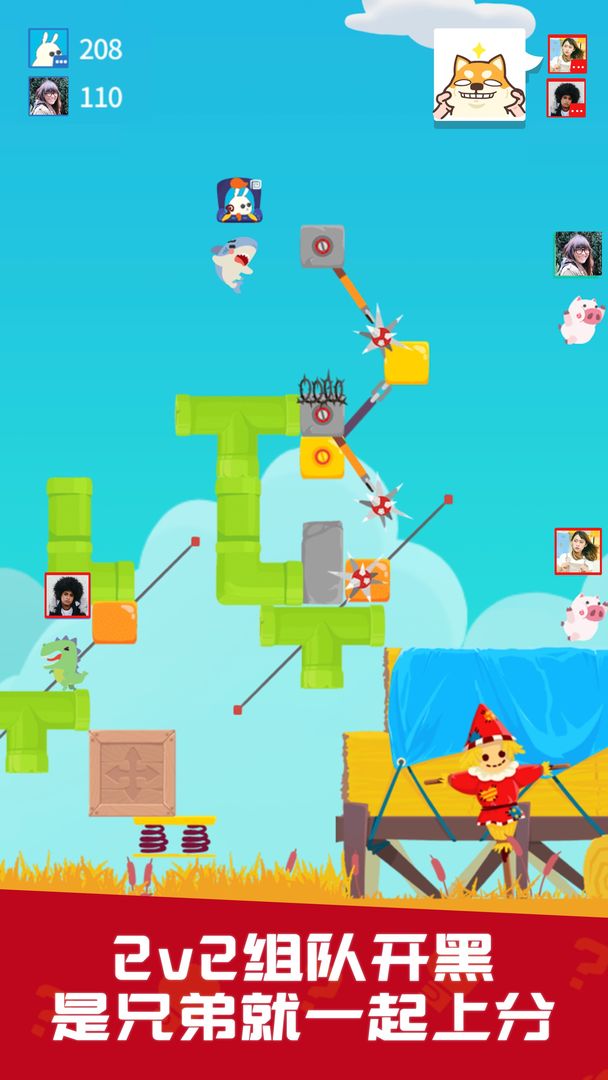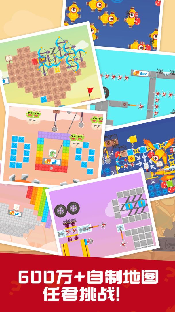 游戏的亮点首先体现在视觉与策略的结合:精致卡通场景搭配动感音乐,重现派对狂欢氛围,细腻装饰和橡胶人角色让人眼前一亮。原创玩法带来深度体验,组件互动(如弹簧上墙或水平锯机关)考验操作精度,而策略性资源分配让每局对战充满变数。百万级自制地图库确保玩法永不重复,从休闲闯关到超神级挑战,满足不同玩家需求。