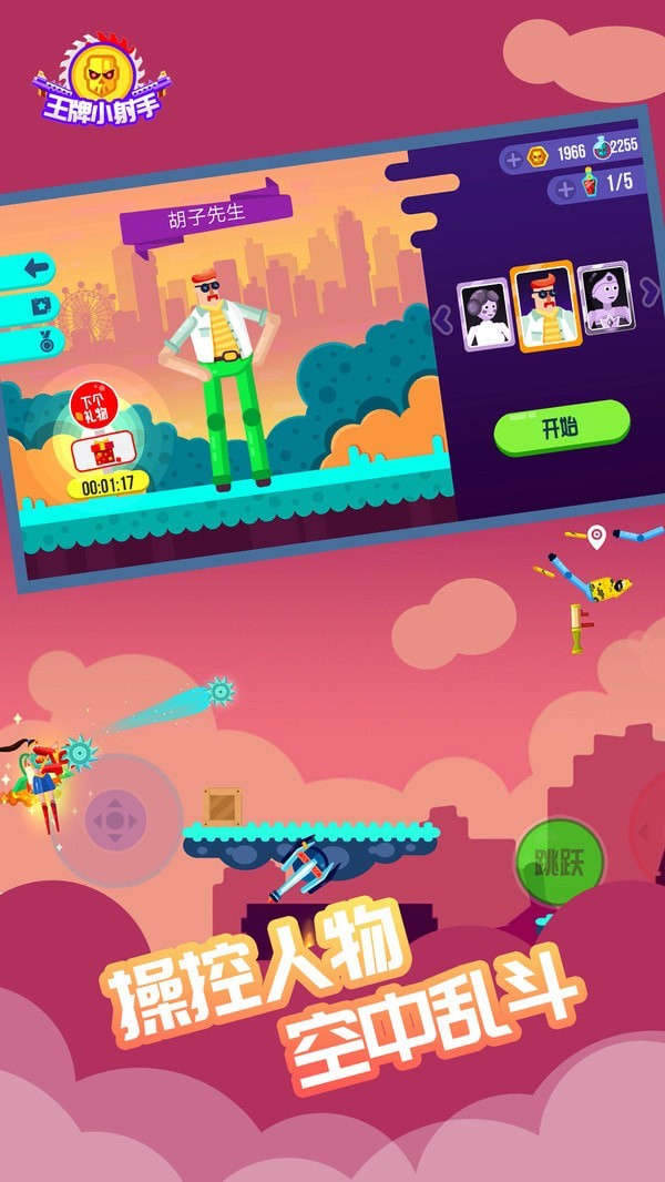 王牌小射手是一款疯狂2D横版多人射击对战手游,它将布偶物理系统与卡通风格完美融合,为玩家带来既刺激又搞笑的战斗体验。在这款游戏中,玩家可以在各种奇葩陷阱场景中展开激烈对决,无论是单人闯关还是多人乱斗,每场战斗都充满意想不到的滑稽场面。核心玩法围绕射击与策略展开,玩家需要操控角色拾取随机掉落的武器道具,从光剑到齿轮飞镖,每一样都能改变战局。游戏采用第三人称视角,操作简单直观,左侧摇杆移动,右侧按钮控制跳跃和射击,让玩家轻松上手,享受从城市街头到神秘丛林的多样化战场环境。