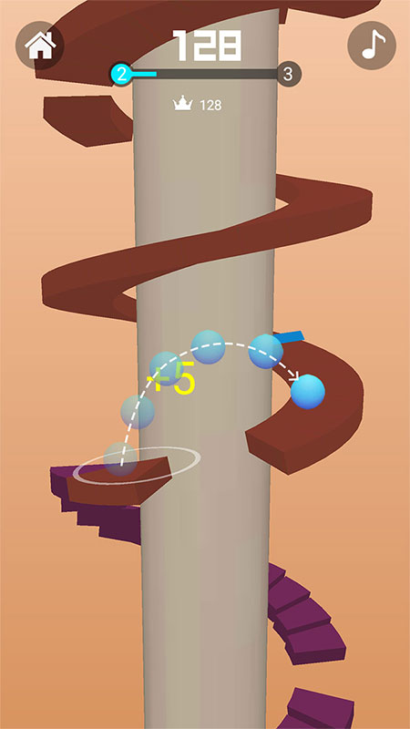 本作采用立体旋转的阶梯场景作为基础框架,球体下落的物理反馈真实自然。参与者通过左右滑动屏幕调整圆柱塔身角度,使小球准确穿过平台缺口。下落过程中可撞击同色模块获取分数加成,但需避开红色危险区域与不同颜色的障碍物。关卡分为经典闯关与无尽模式两种,前者需抵达指定终点,后者则以突破历史最高分为目标。连续下落多层可触发平台粉碎特效,伴随动感背景音效,营造出既紧张又解压的独特氛围。