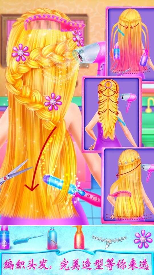 核心玩法围绕美容化妆和时尚搭配展开,我们需要完成桑拿放松、肌肤护理、发型设计、精致妆容、服饰搭配等一系列任务。公主飘逸的长发是重点打造对象,可以使用剪刀、染发剂、护发素等工具自由设计发型,还能挑选眼影、口红、腮红等化妆品为她化妆。衣橱里准备了华丽礼服、街头潮装、休闲裙装等上百种服饰,以及珍珠耳环、水晶皇冠等配饰,完全根据你的审美自由搭配。完成造型后,公主会参加皇家舞会或宴会,展示时尚成果并获得评分。