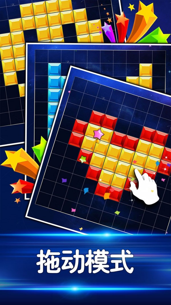 作品中包含六种核心模式带来不同体验:拖动模式需要将底部三个备选方塊拖入10x10宫格中,填满整行或整列即可完成消除;下落模式类似经典俄罗斯方塊,通过控制方塊形状和位置实现整行消除;坠落模式则需要控制方塊颜色,让3个及以上相同颜色的方塊叠在一起消除;消除模式以闯关为目标,达到指定分数即可进入下一关;六边形消除创新采用蜂窝状布局,支持任意方向整行消除;障碍模式则在下落基础上加入随机障碍物,增加更多策略思考。每种模式都配有精心设计的关卡,从简单到复杂循序渐进,保证整个过程充满新鲜感。过程中还能收集各种有趣道具,比如炸弹、魔法棒等,关键时刻能帮大家突破难关。