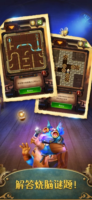故事从主角奥拉夫收到一本神秘笔记开始,笔记揭示了黄铜镇隐藏的失落机械文明。玩家操控奥拉夫探索这座充满齿轮与蒸汽装置的小镇,通过消除关卡收集宝石、锻造零件并发明机械装置。游戏采用竖屏设计,单手即可操作,关卡从简单匹配逐步过渡到复杂机关组合。后期解锁无尽模式和隐藏剧情,每个NPC如矮人机械师或精灵教授都有独立故事线,对话选项影响道具获取,增强了代入感。整体流程分为主线探索和支线任务,玩家需应对传送带、冰冻齿轮等动态障碍。