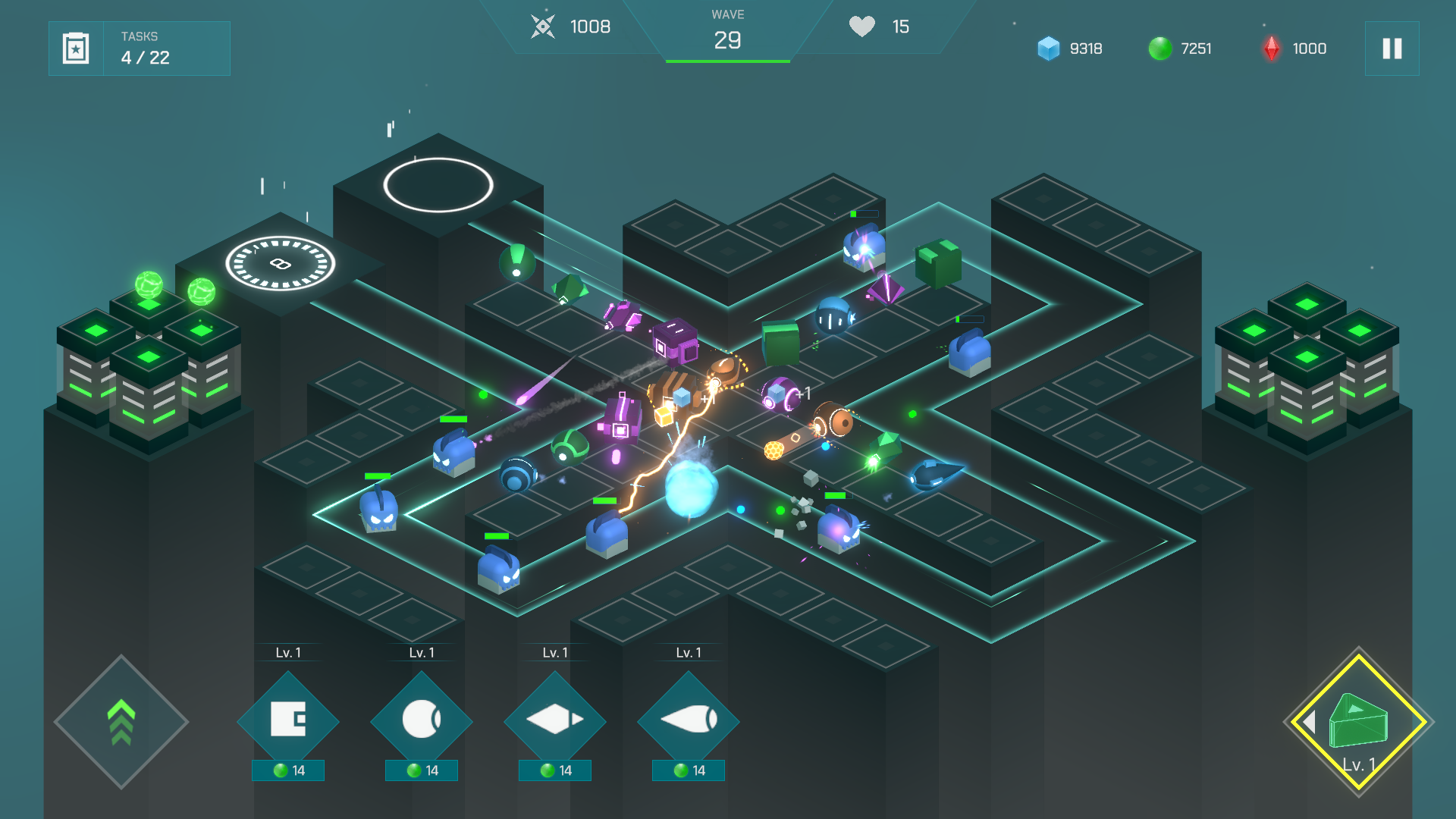 1. 视听沉浸体验:低多边形赛博风场景搭配脉冲光效与电子音轨,满级炮台触发时空坍缩等粒子特效,构筑未来战场沉浸感。2. 环境交互机制:利用十字地形的弯道阻滞效果及临水增益区,实现地形即武器的战略部署。3. 英雄单位介入:独特英雄角色携带扭转战局的主动技能,如全屏减速或范围爆破,弥补防线缺口。4. 隐藏内容探索:通过多周目解锁秘密关卡与成就任务,获取稀有炮台皮肤及资源奖励。