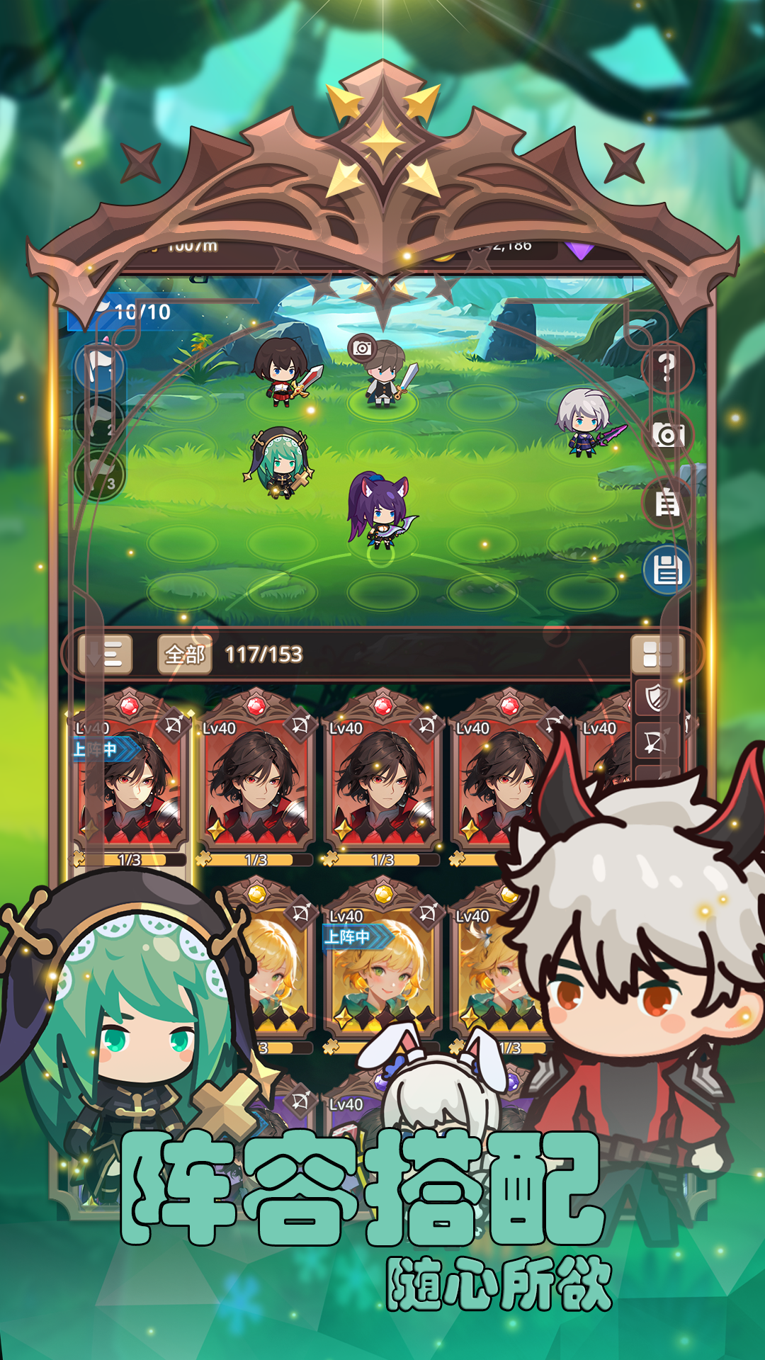 这款游戏采用Q版卡通画风,角色设计可爱又不失酷炫感。玩家开局可以通过抽卡系统招募不同职业的英雄,包括战士、法师、刺客等多种类型,每个角色都有独特技能和背景故事。游戏包含丰富的主线关卡和副本挑战,通过自动寻路和自动战斗系统,角色会自动完成打怪、收集装备等操作。战斗采用回合制策略模式,玩家需要根据敌人特性搭配阵容站位,后期还加入公会社交、竞技场PVP等互动玩法。每日登录和任务系统提供了稳定的资源产出,包括金币、钻石、天赋点等养成素材。