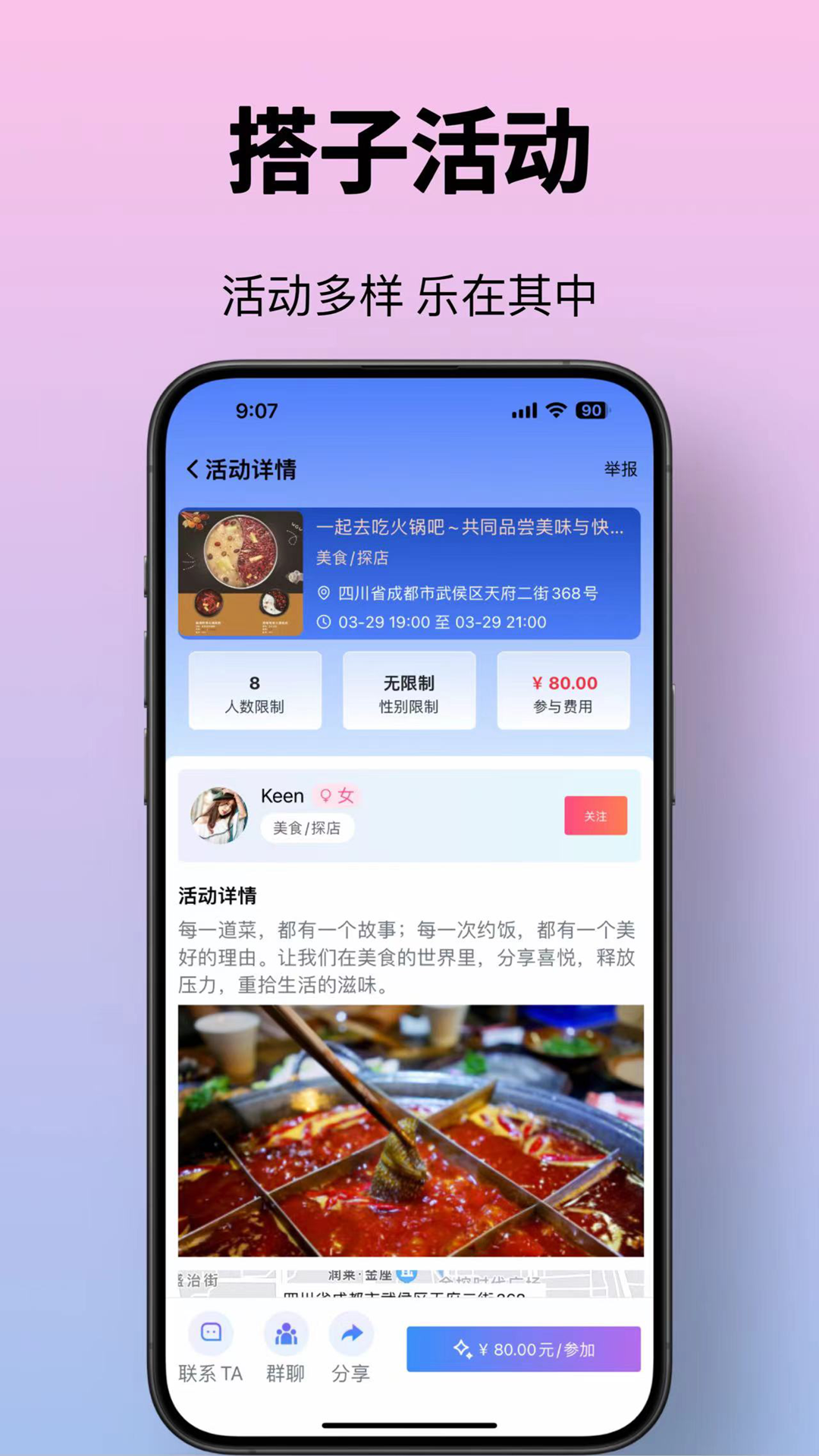 该平台主要分为社交与活动两大功能模块。在社交方面,通过发布动态、参与话题讨论、加入兴趣小组等方式与其他使用者建立联系,拓展社交圈子。平台还提供了个性化推荐功能,根据使用者的兴趣爱好和社交行为,为他们推荐更符合需求的搭子和内容。在活动方面,可以找到各种兴趣搭子,包括漫展cosplay搭子、减肥健身搭子、饭搭子、音乐搭子、电影搭子、旅游搭子、游戏搭子、宠物搭子等。无论是想一起运动挥洒汗水,还是想找志同道合的职场人一起进步,都能在这里实现。平台建立了严格的会员审核机制,确保社区环境的纯净度和体验的优质性,只有经过认证的使用者才能加入特定圈子,享受专属服务。