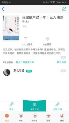 文艺通的竞争优势在于它高效整合资源与体验。交易流程简单安全,线上就能完成购买,省去实体店奔波;订阅机制灵活,免费试读书籍后再决定是否订阅,避免盲目消费。专家咨询优势突出,疑难问题快速响应,提升你的文艺认知;阅读优化如护眼模式,保护视力同时延长使用时间。资源库庞大,原创作品和行业资讯一键获取,省时省心;社区互动性强,交流氛围友好,促进知识共享。性能上,内存小、响应快,实用性与流畅感兼顾,让文艺探索无缝融入日常。相比其他app,它更注重用户参与和价值沉淀,确保每个人从创作者到读者都能平等受益。