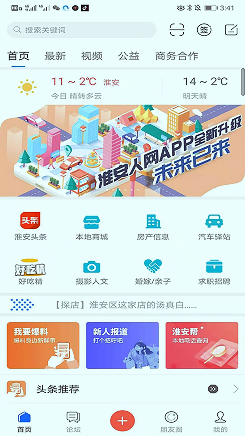 在功能模块上,淮安人网提供多样化的服务内容。新闻资讯板块实时更新本地头条动态,包括社会事件、政策公告和文化活动,用户可随时浏览热点新闻。便民服务涵盖求职招聘、房产交易、医疗预约及天气查询等,例如求职招聘功能整合了本地企业信息,帮助用户快速找到工作机会。社交互动方面,用户可参与圈子讨论(如美食、摄影、亲子),发表帖子或分享动态,并支持语音发帖和图片上传。商城板块提供本地商家优惠和商品购买,如日用品和出行券,结合爆料窗口鼓励用户分享身边好人好事。应用界面简洁直观,操作简单,适合各年龄段用户使用。