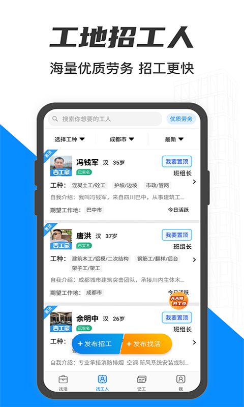 用了它,最大的感受就是快和准。智能匹配让招工找活像精准导航,告别大海捞针,效率翻倍。在线沟通和视频面试功能,让距离不再是问题,天南地北也能面对面谈妥,省下大量跑腿的时间和路费。社区互动和信用评价让平台粘性十足,工友和老板都愿意长期用,形成良性循环。从找工作、亮技能、谈待遇到完工评价,它提供的是一条龙服务,工友能更好展示自己,老板能高效找到合适人手,实实在在帮大家省心省钱。每天大量更新的真实招工找活信息,覆盖上千种工种,选择面超广。