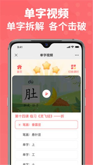 该应用围绕书法学习的闭环精心设计功能模块。核心是与课堂教学内容同步配套,用户可在课后便捷地获取复习资料。它提供海量的单字书写示范视频,用户可针对特定汉字反复点播学习,观看动画演示掌握笔画、结构要点。学习后,系统会推送对应的课后练习任务,用户完成书写后可拍照提交作业。应用的核心功能之一是智能评测:学生书写单字后,通过拍照即可获得对字形质量、重心、大小、位置等多维度的即时自动评分与分析,帮助快速识别书写问题。作业可提交给老师进行远程人工点评,形成有效学习闭环。