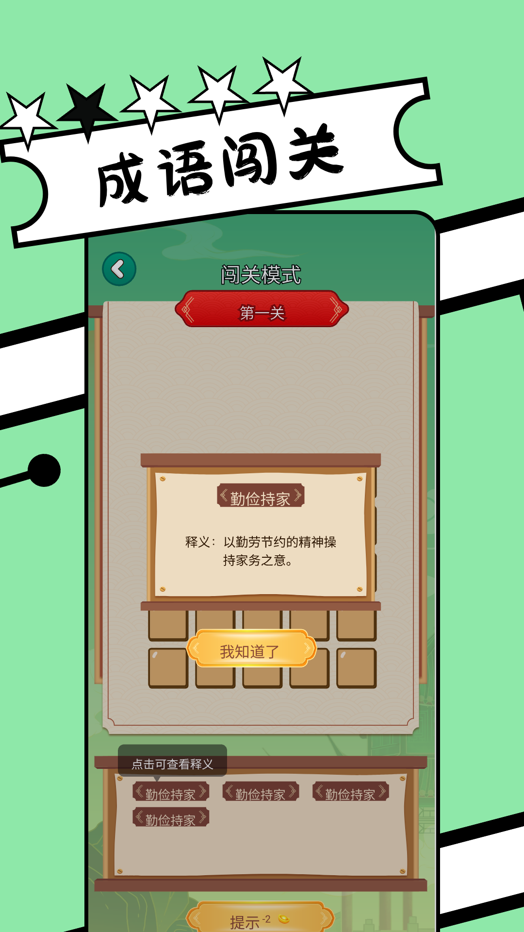 775乐园采用了关卡制闯关形式,收录了超过1000个常用成语,并持续更新题库。每个关卡都会将成语汉字分散排列,需要按正确顺序找出并组合才能通关。应用包含成语接龙、消消乐、填空等多种互动模式,比如在成语消消乐中滑动屏幕连接文字完成消除,系统会同步显示成语释义和典故。所有成语均配有详尽的解释、出处和用法示例,部分还附带动画典故短片,帮助理解记忆。界面采用清新简约风格,操作直观,首次使用会有动态指引教程,完全不用担心上手难度。