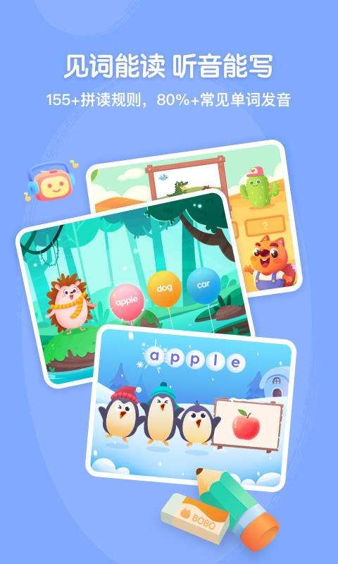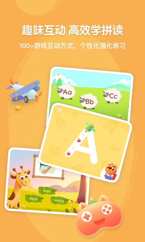 • 沉浸式互动学习:设计超过100种游戏化场景,如单词工厂、农场冒险、发音闯关等,将拼读练习转化为趣味任务,显著提升学习专注度。• AI智能辅助系统:搭载语音评分技术,实时检测孩子跟读准确度,自动标记发音错误并提供纠正反馈。学情报告功能可视化学习进度,精准定位薄弱环节。• 多模态内容融合:原创动画儿歌、互动式词卡、手写描红功能相结合,同步训练听说读写能力。例如通过节奏感强的拼读歌曲深化发音记忆,利用描红回放功能规范字母书写笔顺。