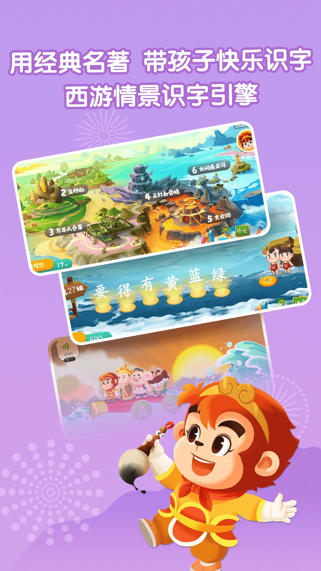悟空识字是一款专注3-8岁儿童汉字启蒙的教育类手机应用,以经典名著西游记为故事背景,通过科学设计的多元识字法,将1200个常用汉字、5000个词语及60册阶梯阅读内容融入趣味互动中。其核心目标是通过每日10分钟的游戏化学习,帮助幼儿在听、说、认、读等环节建立汉字认知基础,为幼小衔接及自主阅读能力打下扎实根基。