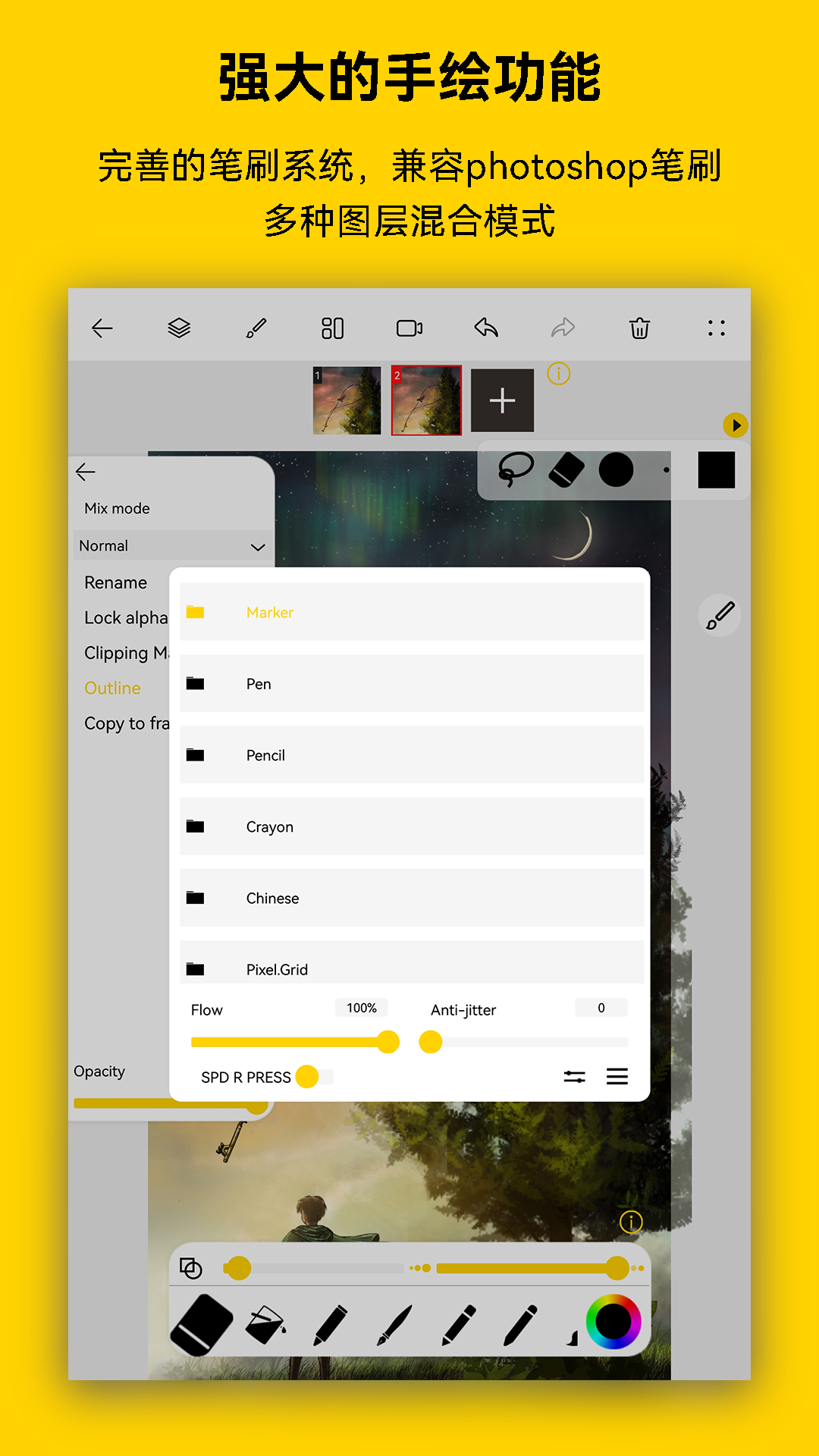 你可以体验到逐帧手绘与骨骼原件动画工具于一体的创作方式,还能享受3D手绘和3D运镜带来的炫酷效果。笔刷系统十分强大,兼容并支持导入PS格式笔刷并高度还原,让你可以无缝衔接熟悉的创作工具。创作过程中可以享受无限图层、多种混合模式,还能锁定透明度和使用剪贴蒙版。如果你有视频创作需求,还能导入视频进行再创作,让创作灵感得到最大程度的发挥。