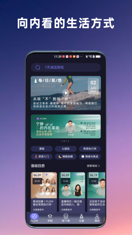 FLOW冥想的独特价值体现在多维互动生态:建立线上社区,用户可参与话题讨论、分享体验并获得同伴支持,形成持续练习的正向激励;定期举办城市线下冥想活动,创造安全沉浸的集体练习空间,强化归属感;整合专业心理睡眠资源,如心理睡眠师定制课程、睡前仪式引导及睡眠数据分析工具,科学改善失眠问题。其每日梦境电台与明星陪伴入睡等创新形式,进一步提升了用户体验的趣味性与陪伴感。