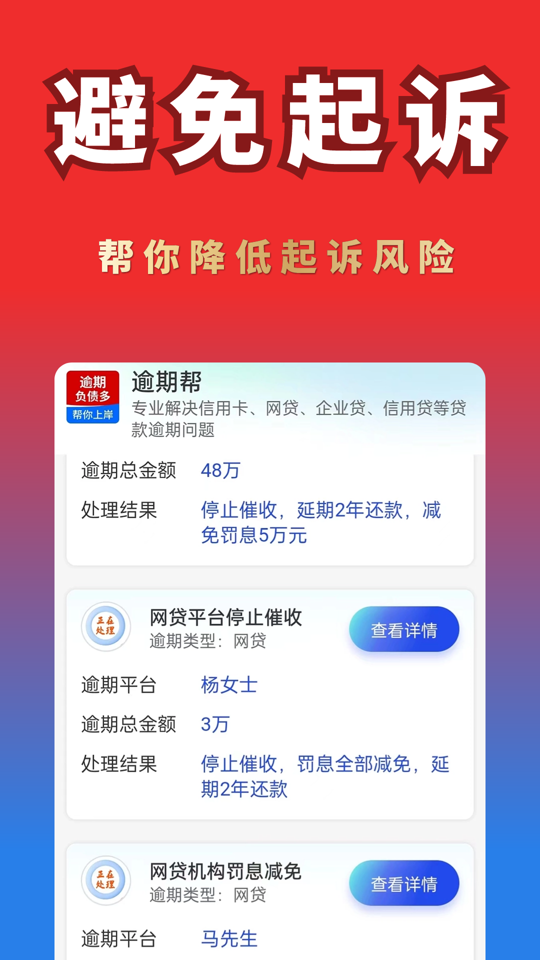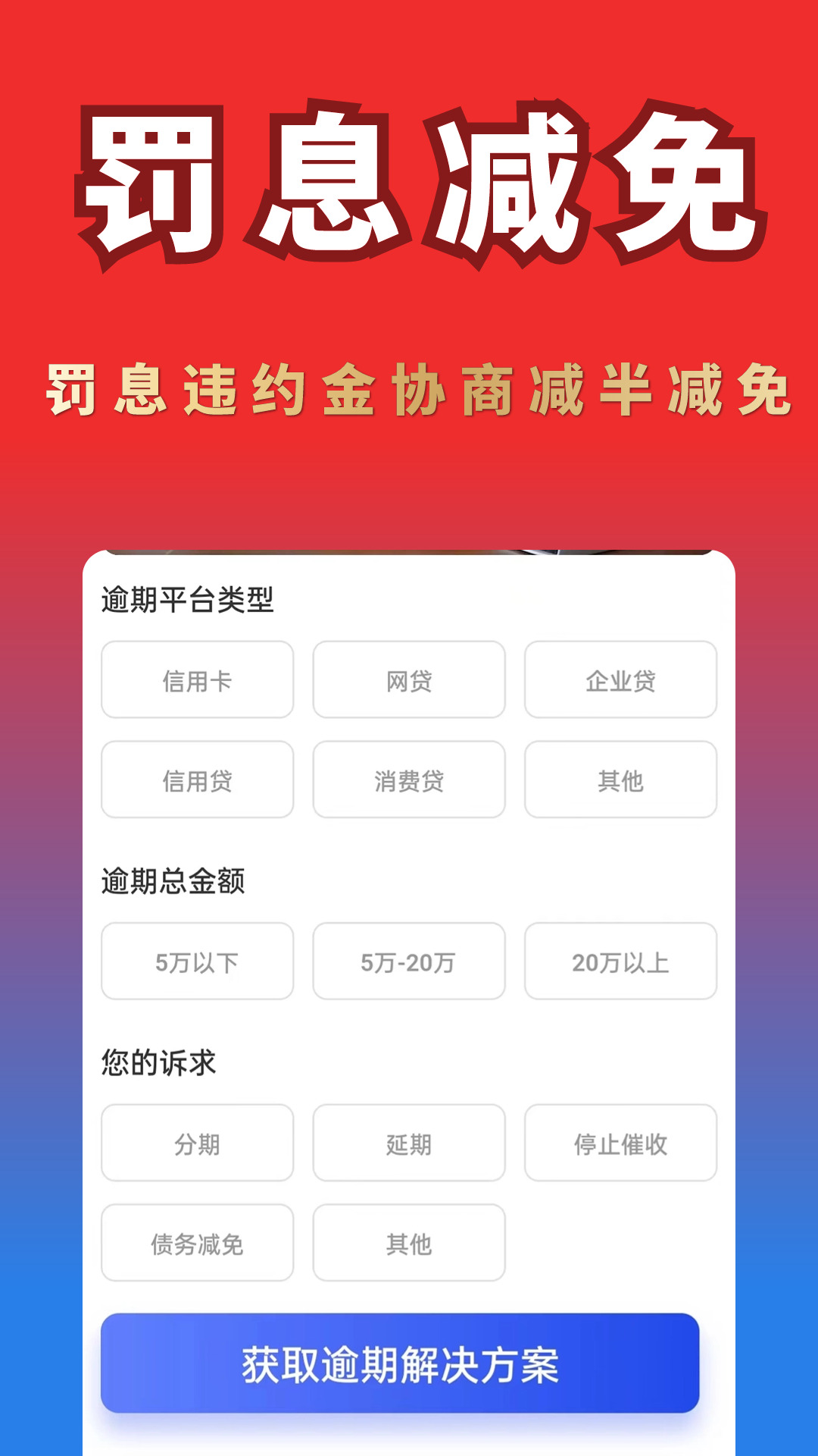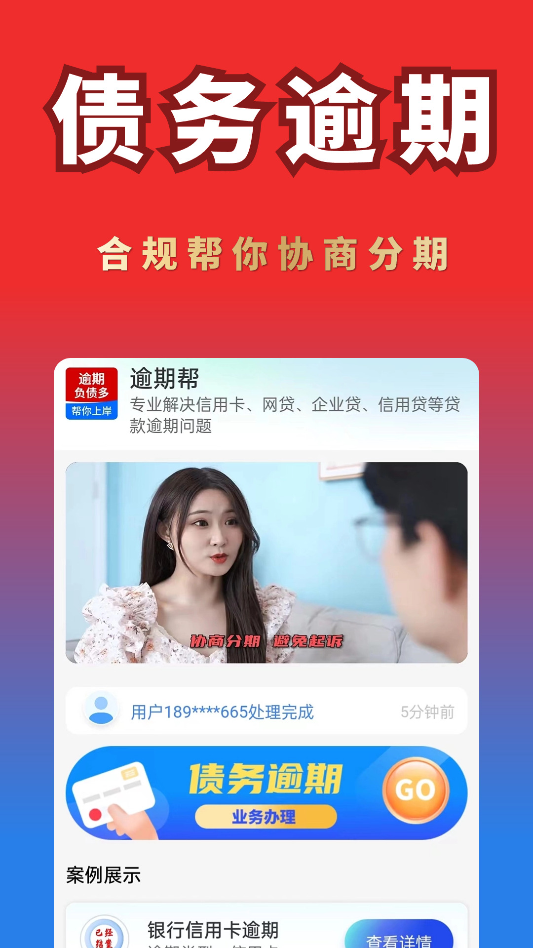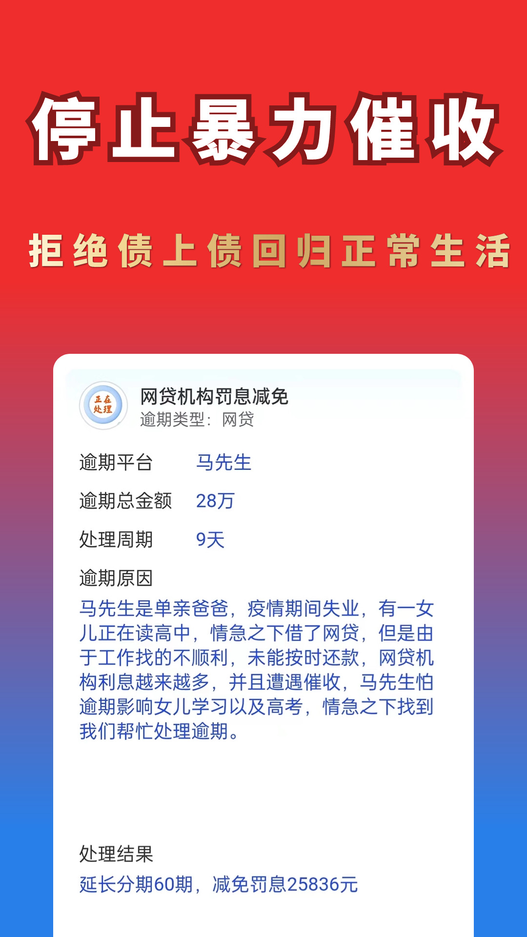 逾期帮是一款专注解决各类债务逾期问题的专业服务平台,通过智能评估与专业协商相结合的方式,为面临信用卡、网贷、企业贷等债务困扰的人群提供合法合规的解决方案。平台依托专业团队和成熟的处理流程,致力于帮助债务人实现债务重组、减免罚息、停止催收等核心目标,最终达成债务上岸的目的。其服务覆盖全国范围,采用标准化操作流程,确保每位使用者都能获得量身定制的债务处理方案。
