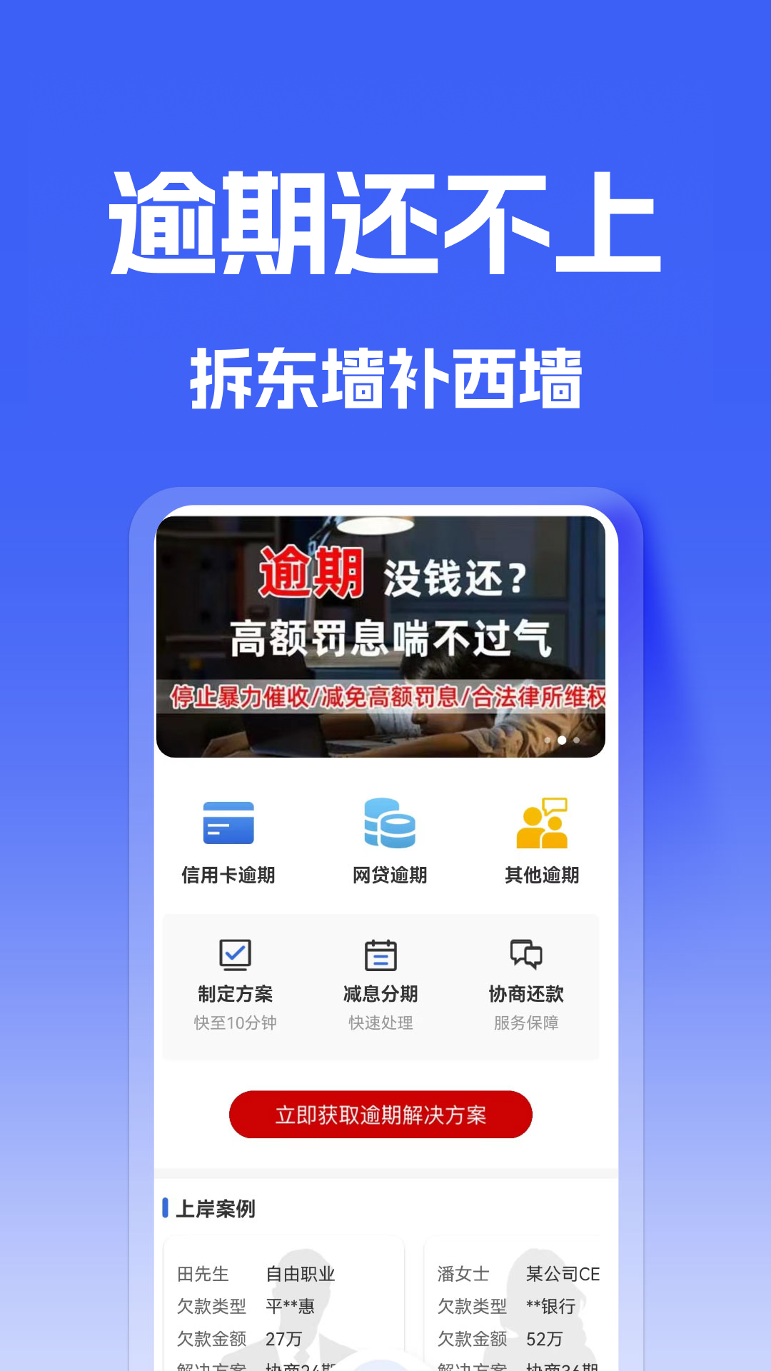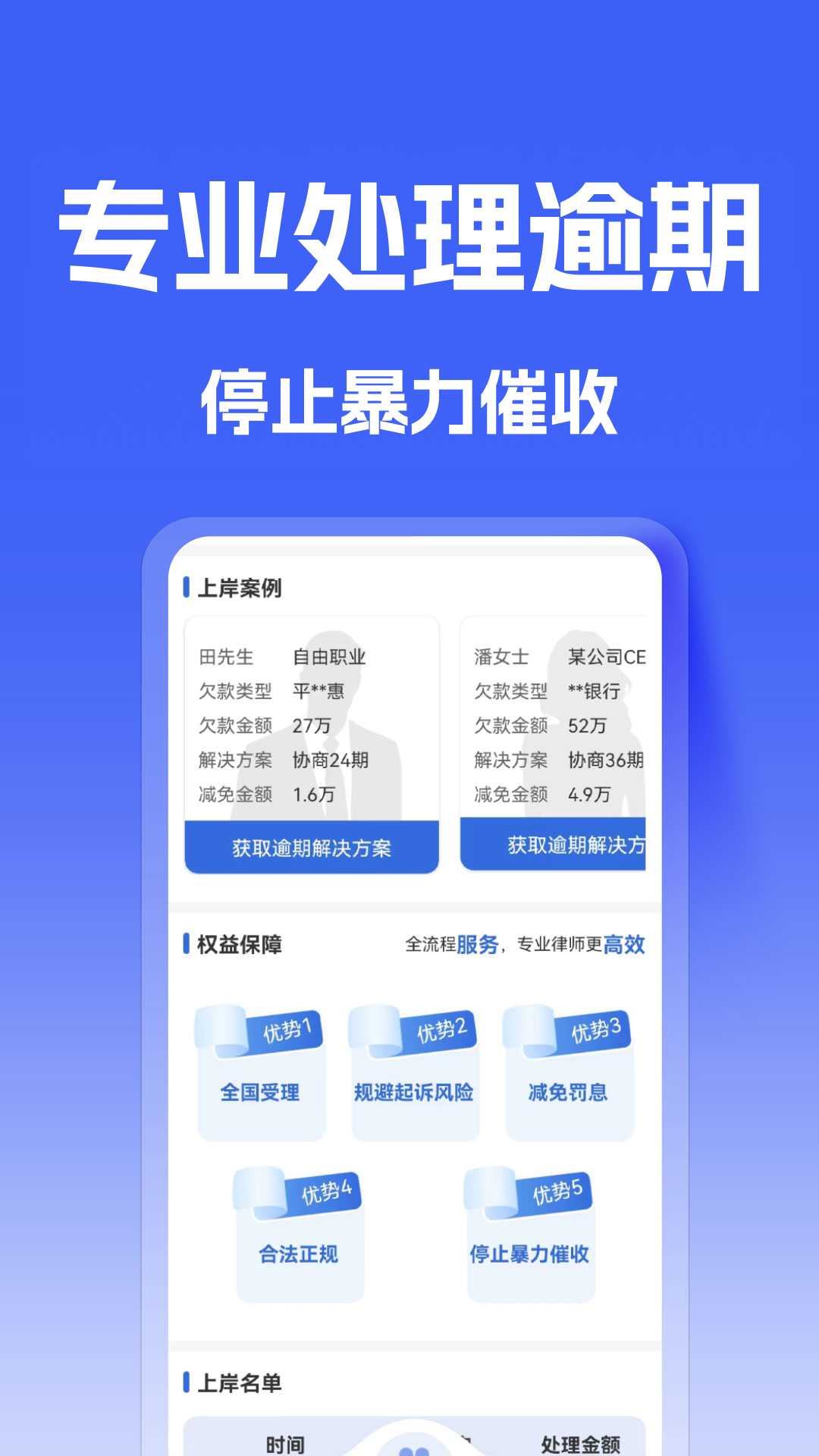 债务逾期上岸是一款专注于解决个人债务逾期问题的智能服务平台,通过科技手段与专业服务相结合,为面临信用卡、网贷等各类债务困扰的人群提供全流程解决方案。平台立足于当前社会普遍存债务压力问题,采用智能化分析系统对债务状况进行全面评估,根据个人实际还款能力制定科学合理的还款计划,同时配备专业法律团队提供全方位支持,致力于帮助债务困扰者逐步摆脱财务困境,重建信用体系,实现真正的财务自由。